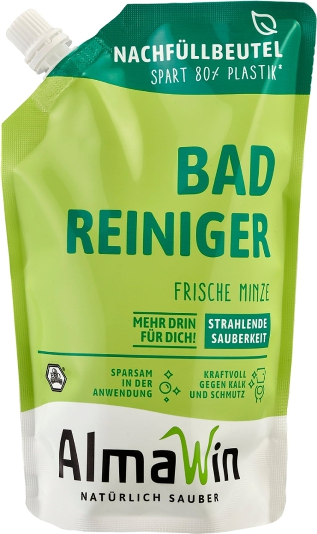 De eco-gecertificeerde badkamerreiniger is geschikt voor alle zuurbestendige oppervlakken in de badkamer. Het lost alle soorten vuil op, evenals kalk- en zeepresten, en laat een frisse, muntachtige geur achter.