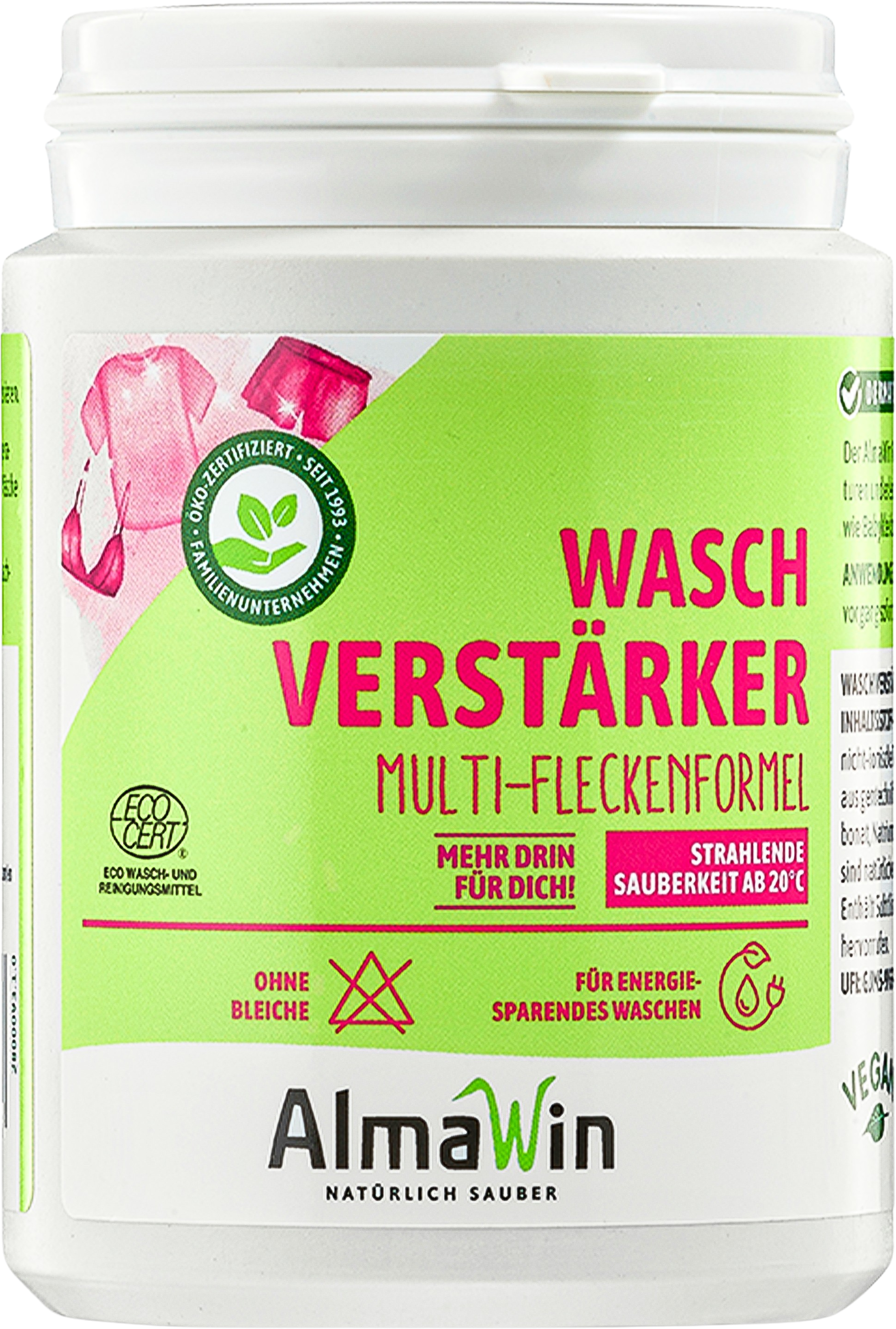 De wasbooster van AlmaWin is een praktisch wasadditief dat de wasprestaties van je vloeibare wasmiddel verhoogt vanaf een wastemperatuur van 20°C! Het is bijzonder geschikt voor sterk vervuild textiel zoals babykleding of werkkleding, omdat het zelfs hardnekkige vlekken zoals cacao, bloed, gras, make-up of vet moeiteloos verwijdert.