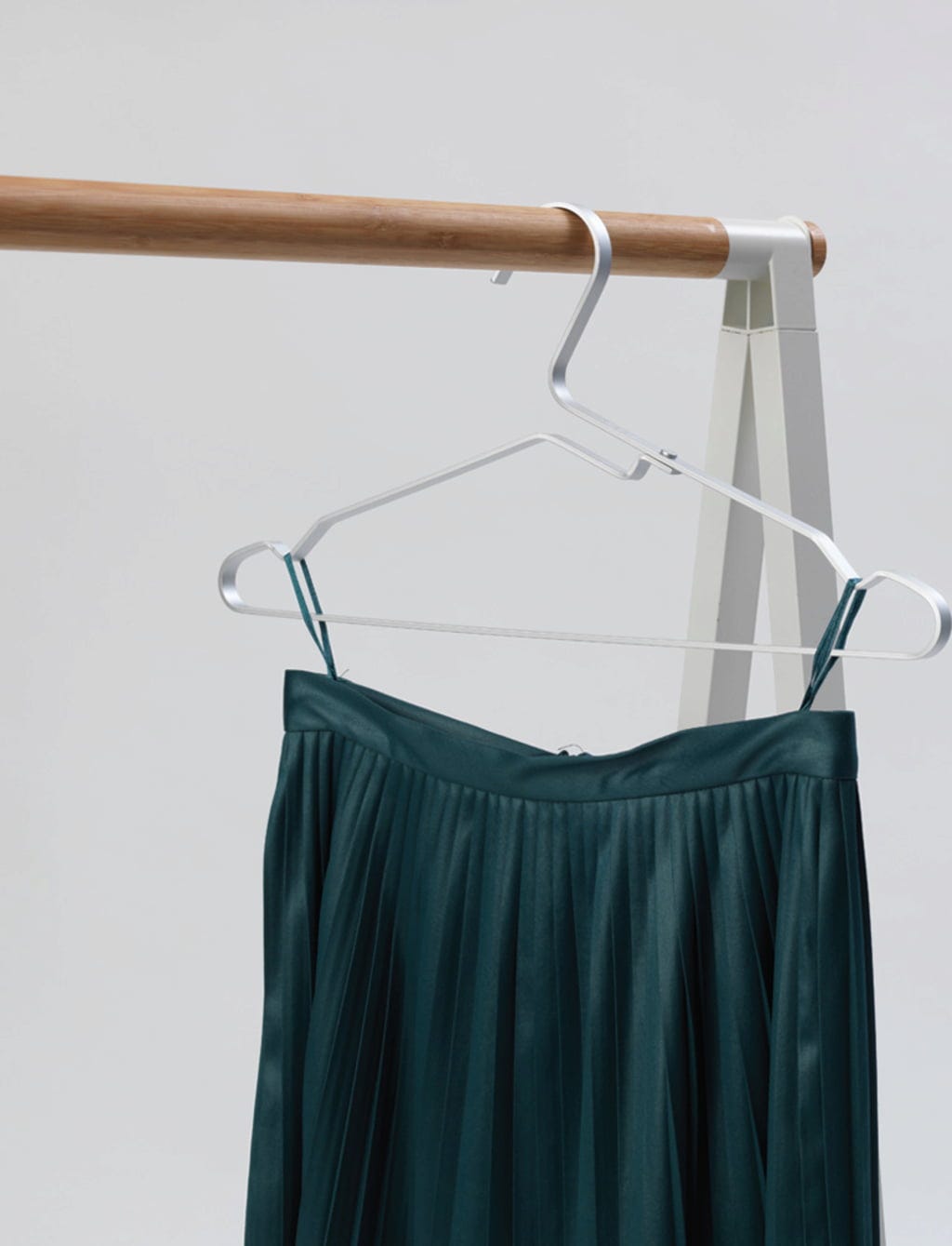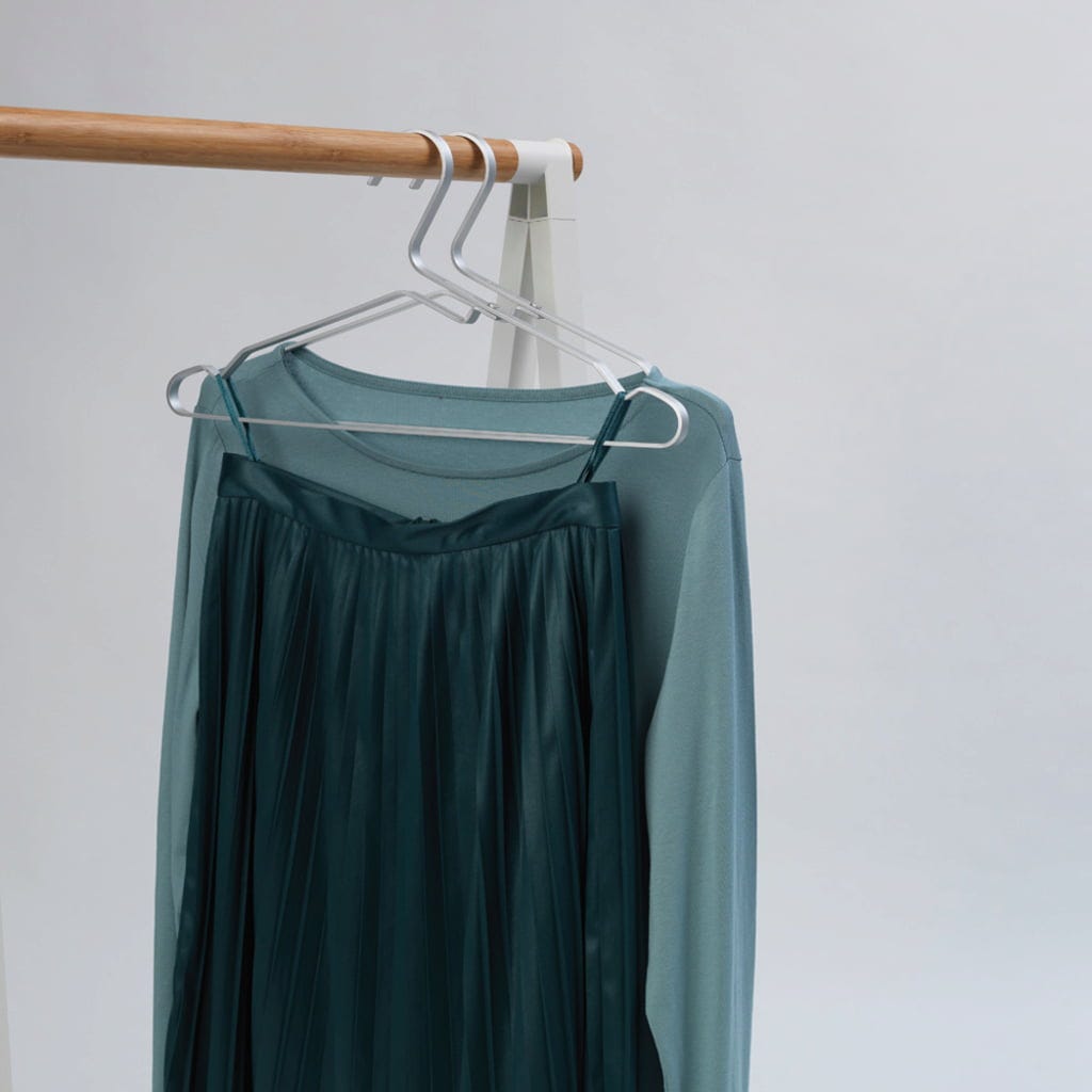 De slim gebogen hanger maakt het gemakkelijk om T-shirts, truien of zelfs overhemden met knopen op te hangen zonder de stof uit te rekken. Het materiaal is gemaakt van duurzaam, geanodiseerd aluminium en dankzij de slimme inkeping aan de zijkanten zijn deze hangers ook perfect voor blouses en jurken met kleerhangers. Een geweldige allround hanger - die je kleding niet uitrekt en wordt geleverd met 2 jaar garantie.