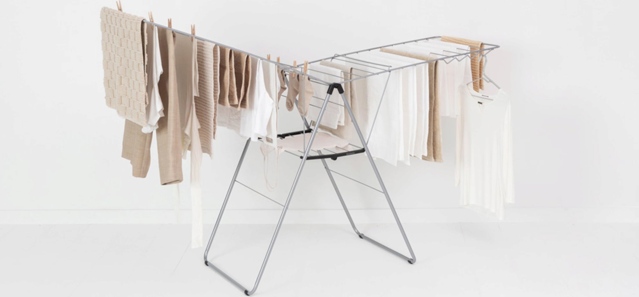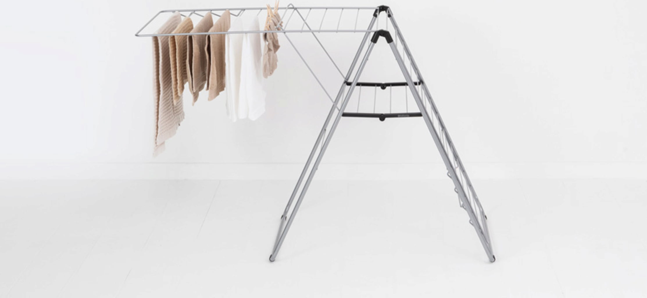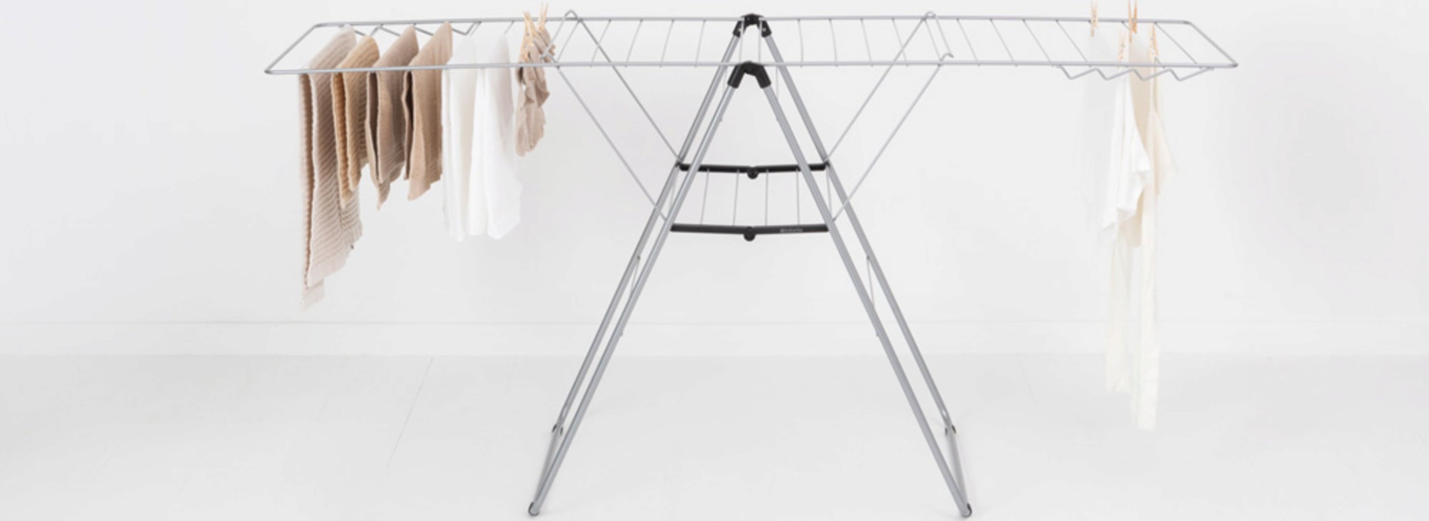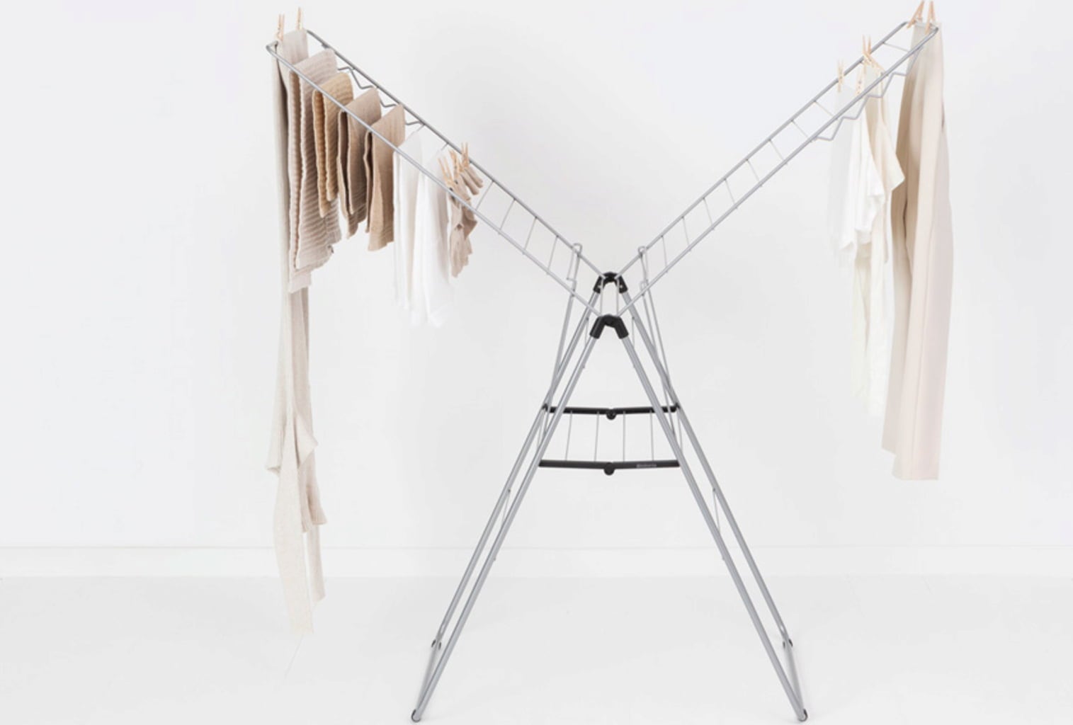 Bijzonder praktisch: dankzij het driehoekige ontwerp van het frame kunnen de vleugels ook afzonderlijk worden uitgeklapt of op verschillende hoogtes worden gebruikt zonder dat het droogrek kantelt.