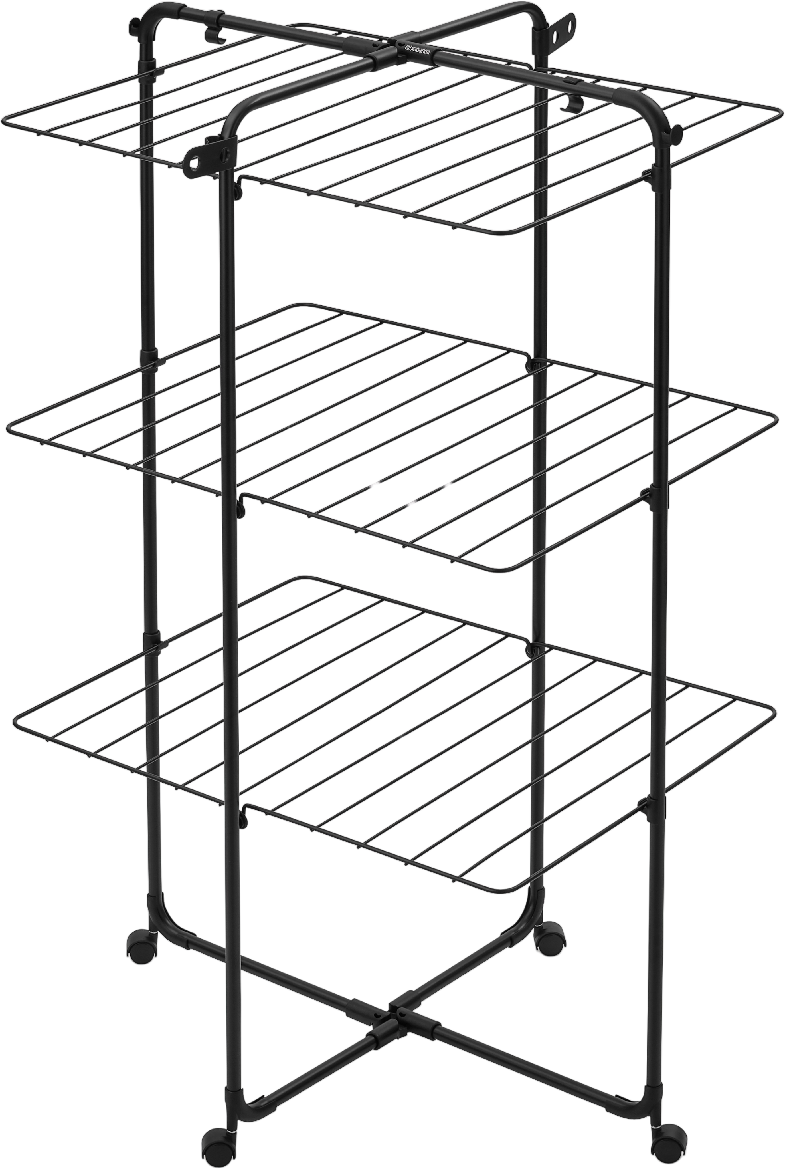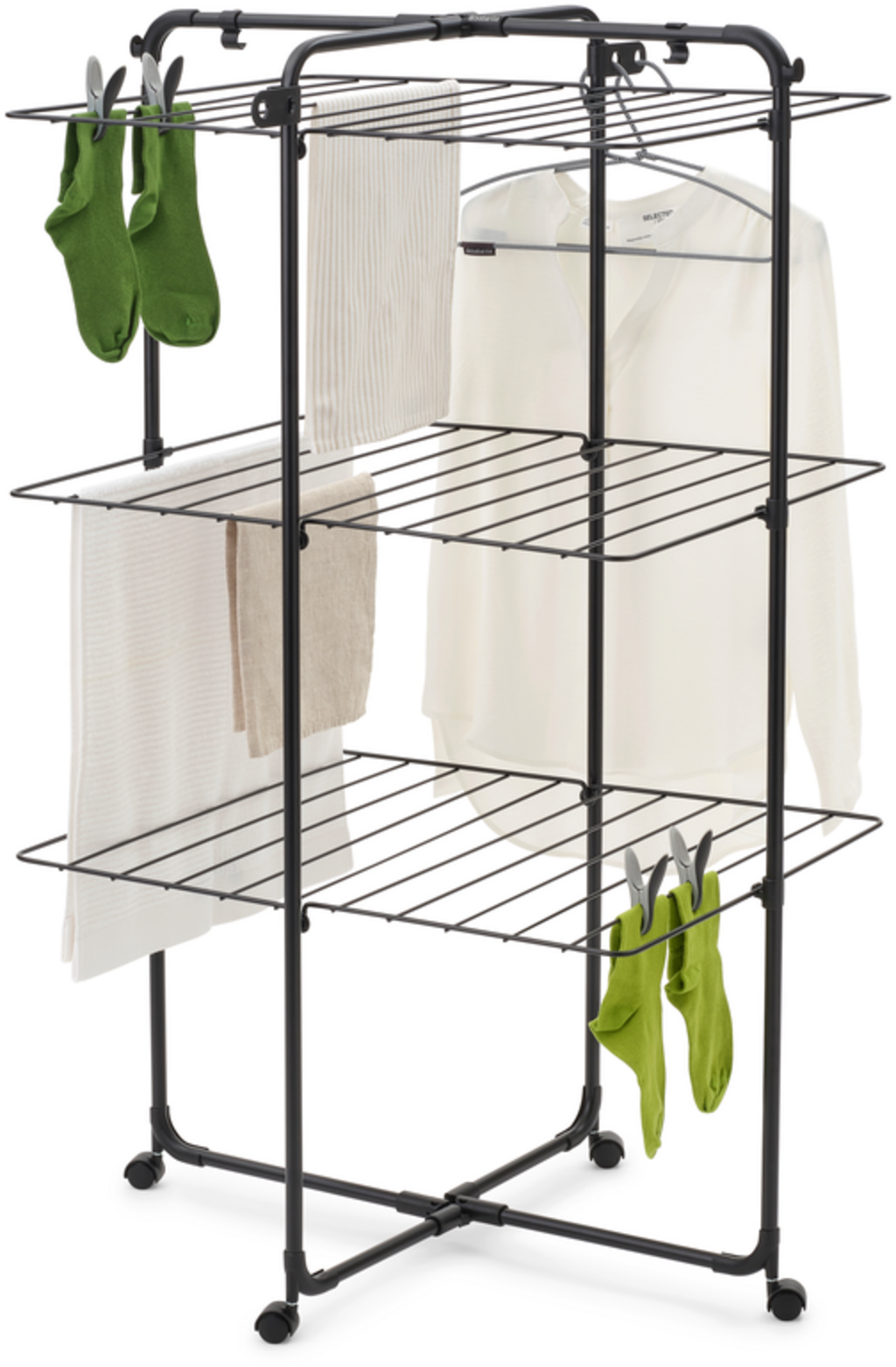 De HangOn Droogtoren met een drooglengte van 23 meter is de perfecte dagelijkse hulp als je veel wasgoed wilt drogen op een ruimtebesparende manier. De drie flexibel in- en uitklapbare planken bieden genoeg ruimte voor kleine en grote stukken wasgoed - van overhemden tot handdoeken. Dankzij de vier wielen kan het droogrek moeiteloos worden gedraaid en in elke hoek worden geschoven.