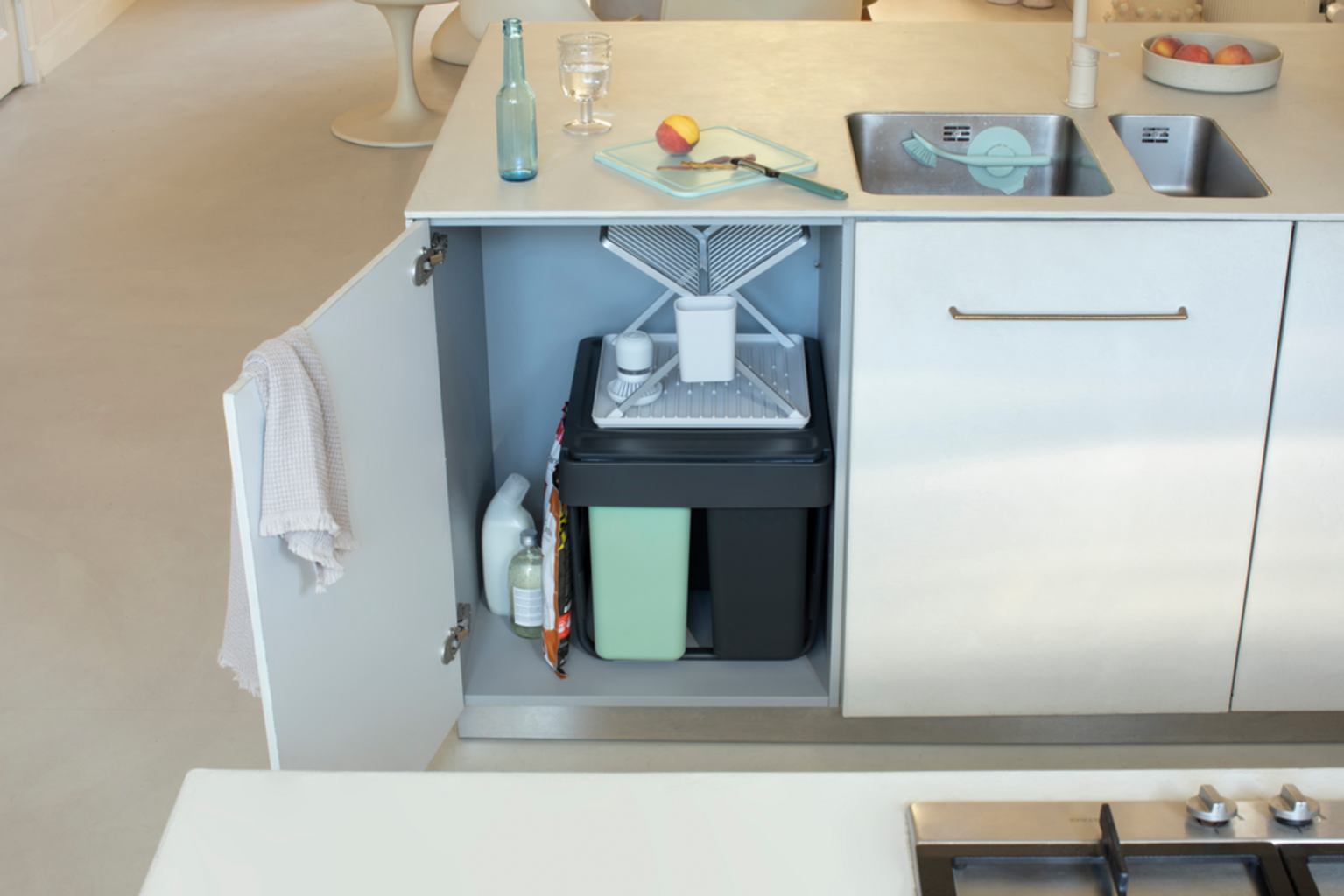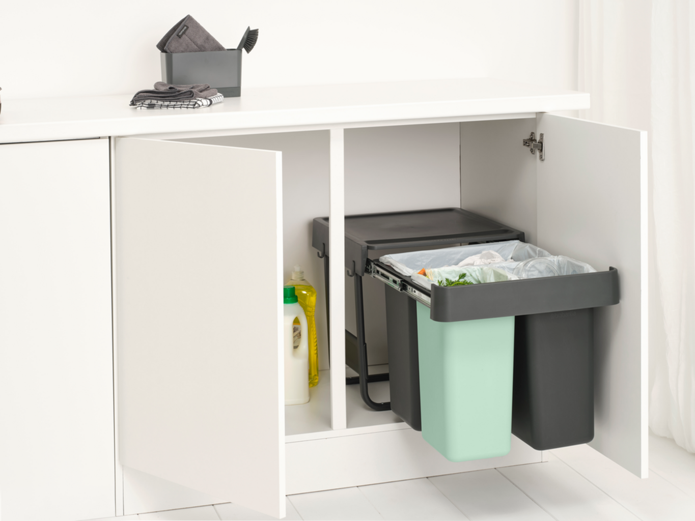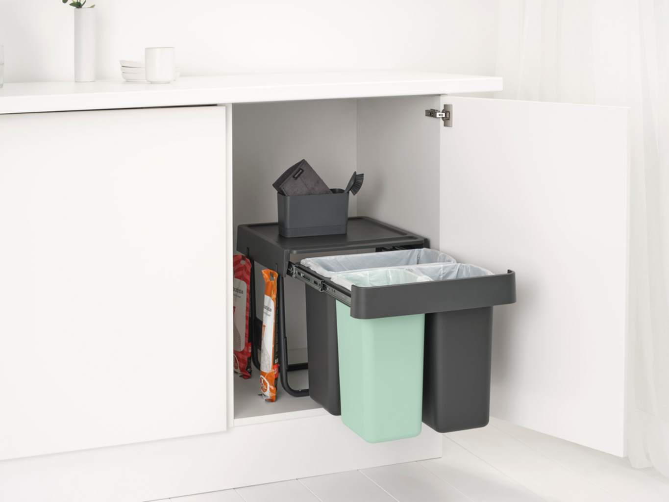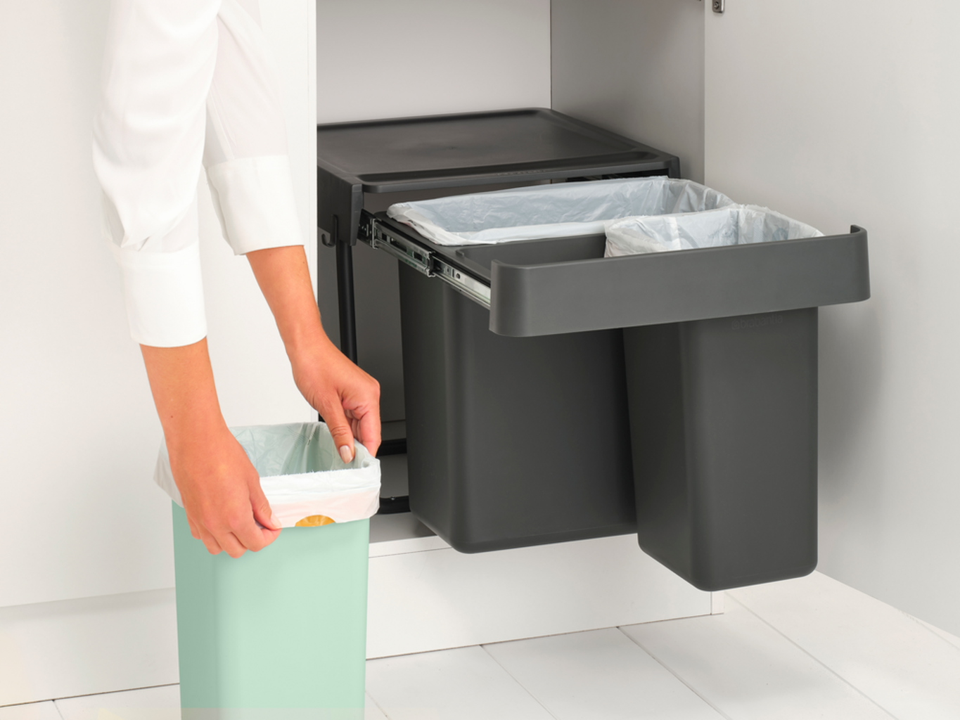De slimme inbouwemmers uit Brabantia's Sort & Go-collectie kunnen perfect worden verborgen dankzij hun ruimtebesparende ontwerp.