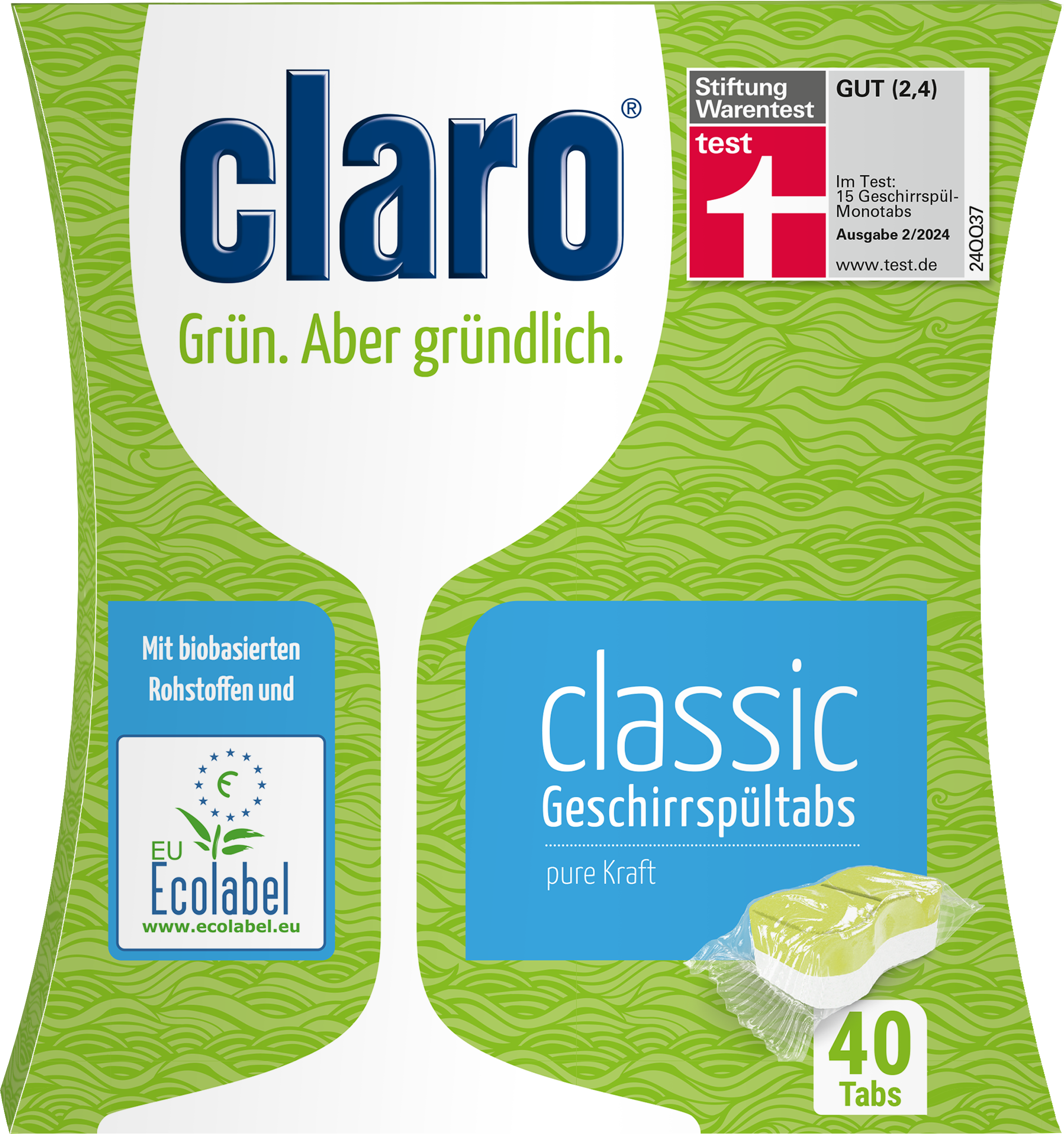 De Classic Tabs van claro zijn een betrouwbaar middel tegen vuil vaatwerk en verwijderen moeiteloos zelfs hardnekkige, opgedroogde etensresten. Ze zijn individueel verpakt in wateroplosbare folie en ontvouwen geleidelijk hun effect. De tabs werken zeer krachtig tegen vuil dankzij het korstverwijderende effect, maar zijn ook zacht voor de vaat dankzij de glas- en decorbescherming. De activator voor lage temperaturen zorgt voor schitterende resultaten, zelfs bij lage temperaturen.
