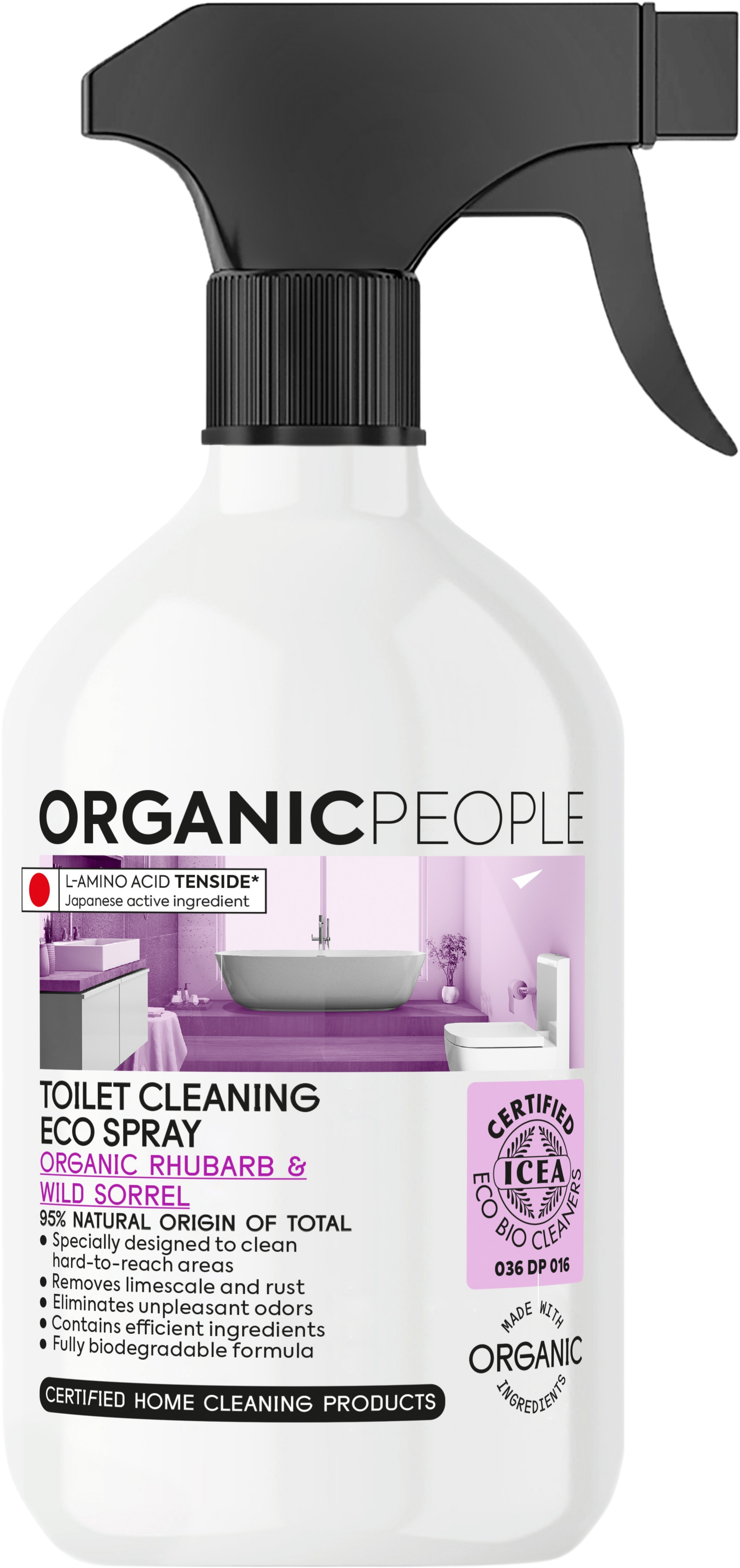 Dankzij het spray-opzetstuk is de praktische toiletreiniger van ORGANIC PEOPLE bijzonder gemakkelijk in gebruik en reinigt zelfs moeilijk bereikbare plekken perfect. Met een mix van rabarber- en krulzuringextracten verwijdert het onaangename geurtjes en kalkaanslag en laat het de oppervlakken glanzen. De formule van de reiniger is volledig biologisch afbreekbaar.
